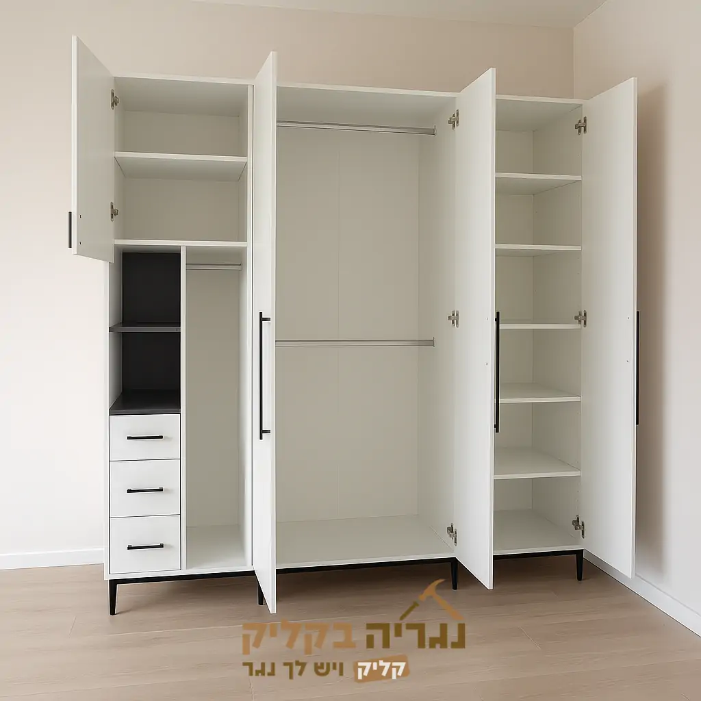 ארון בגדים מרווח בעיצוב מודרני ונקי, כולל ארבע דלתות פתיחה, אזורי תלייה, מדפים ומגירות נוחות. שילוב גוונים של לבן עם נגיעות שחור יוצר מראה יוקרתי ואלגנטי. הארון עומד על רגליים גבוהות בעיצוב מינימליסטי, עשוי MDF איכותי בציפוי פורמייקה עמידה. אידיאלי לחדרי שינה המעוצבים בקו עכשווי עם דגש על סדר ואסתטיקה.