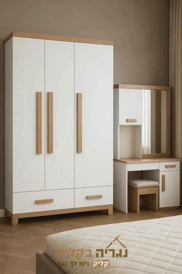 סט ריהוט לחדר שינה או חדר נוער, בעיצוב מודרני ונקי בגווני לבן ועץ אלון טבעי.הסט כולל ארון בגדים רחב עם שלוש דלתות ושתי מגירות תחתונות, לצד שידת איפור/עבודה עם מראה גדולה, מגירות ומדף פתוח, וכן שרפרף מרופד תואם.