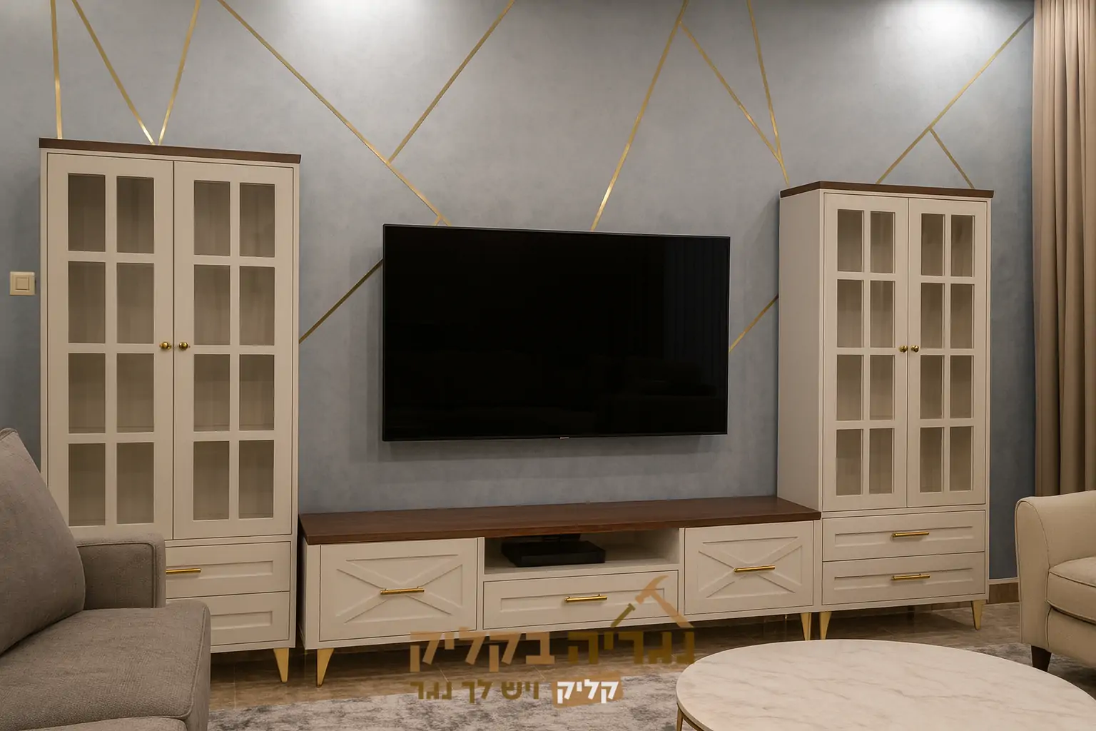 מזנון טלוויזיה יוקרתי בעיצוב קלאסי על-זמני, משולב עץ בגוון אגוז כהה עם גוף בגוון שמנת עדין. כולל שתי יחידות ויטרינה גבוהות עם דלתות זכוכית ומדפים לתצוגת פריטים דקורטיביים, לצד יחידת טלוויזיה מרכזית עם מגירות רחבות וידיות זהב אלגנטיות. שילוב הצבעים והפרטים המוזהבים מעניקים לחלל מראה יוקרתי, חמים ומזמין – מושלם לסלון בעיצוב קלאסי או מודרני-על-זמני.