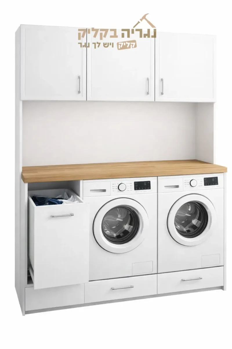 יחידת כביסה מעוצבת בהתאמה אישית הכוללת שתי מכונות כביסה, מגירה נשלפת לכביסה מלוכלכת בצד שמאל, ומשטח בוצ’ר איכותי בגוון אלון טבעי לעבודה נוחה ונקייה. בחלק התחתון מגירות בגובה 15 ס"מ לאחסון חומרי ניקוי ואביזרים, ובחלק העליון שלושה ארונות דלתות נפתחות לאחסון מקסימלי וסידור מושלם.
