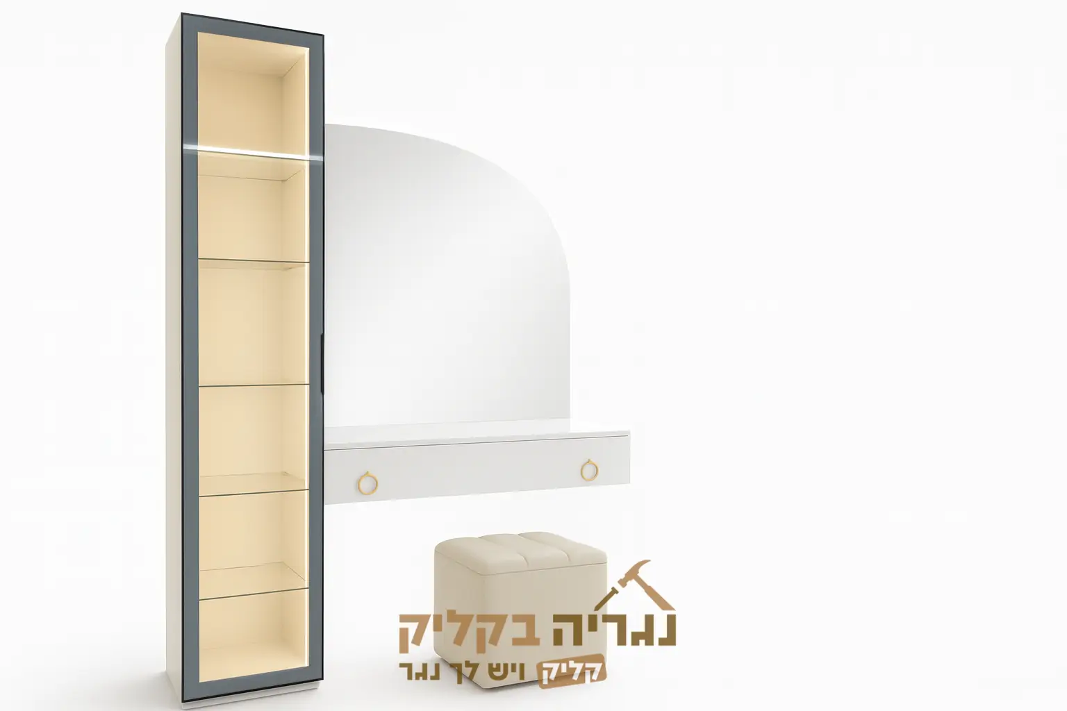 לצדה מוצבת ויטרינה זכוכית עם מסגרת שחורה ותאורת LED פנימית רכה, המשווה למראה יוקרתי ומזמין.