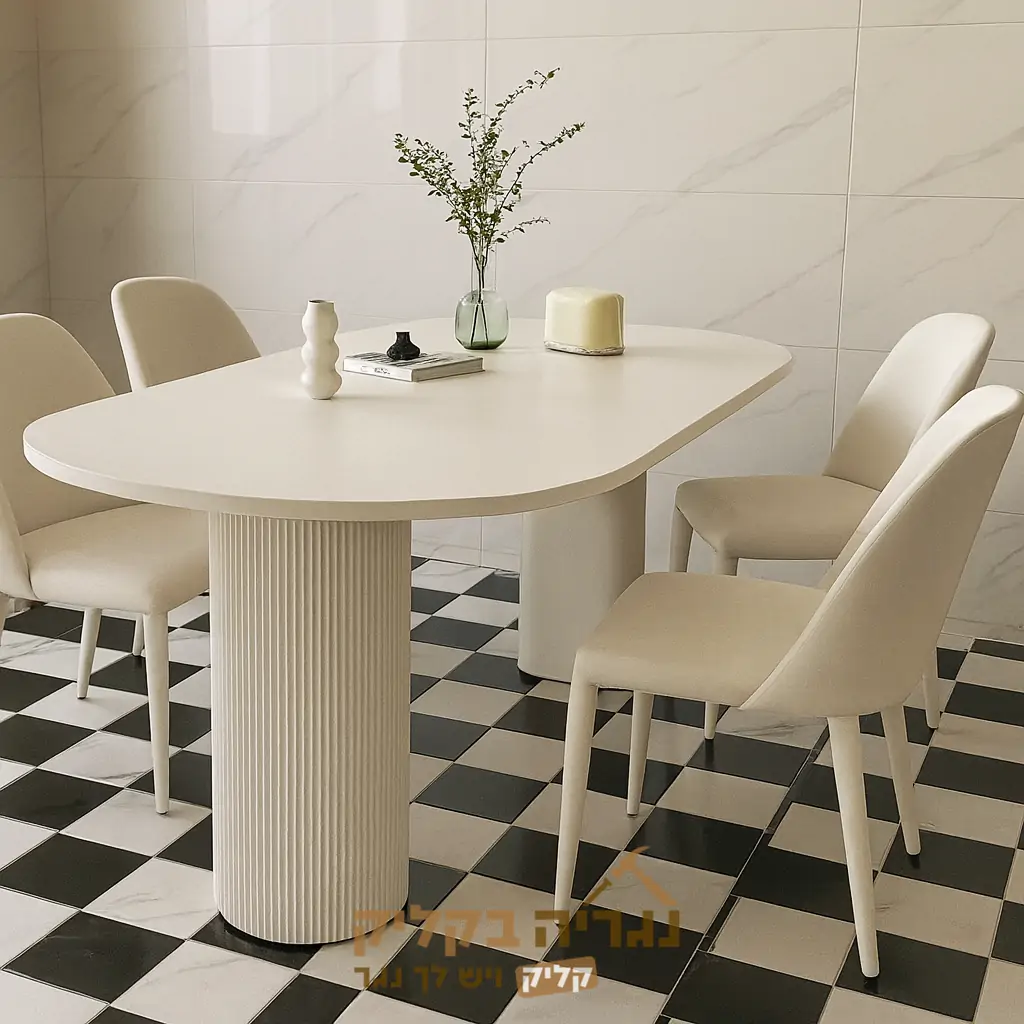 שולחן אוכל יוקרתי בעיצוב מודרני-אלגנטי, המשלב קווים רכים ומראה נקי.