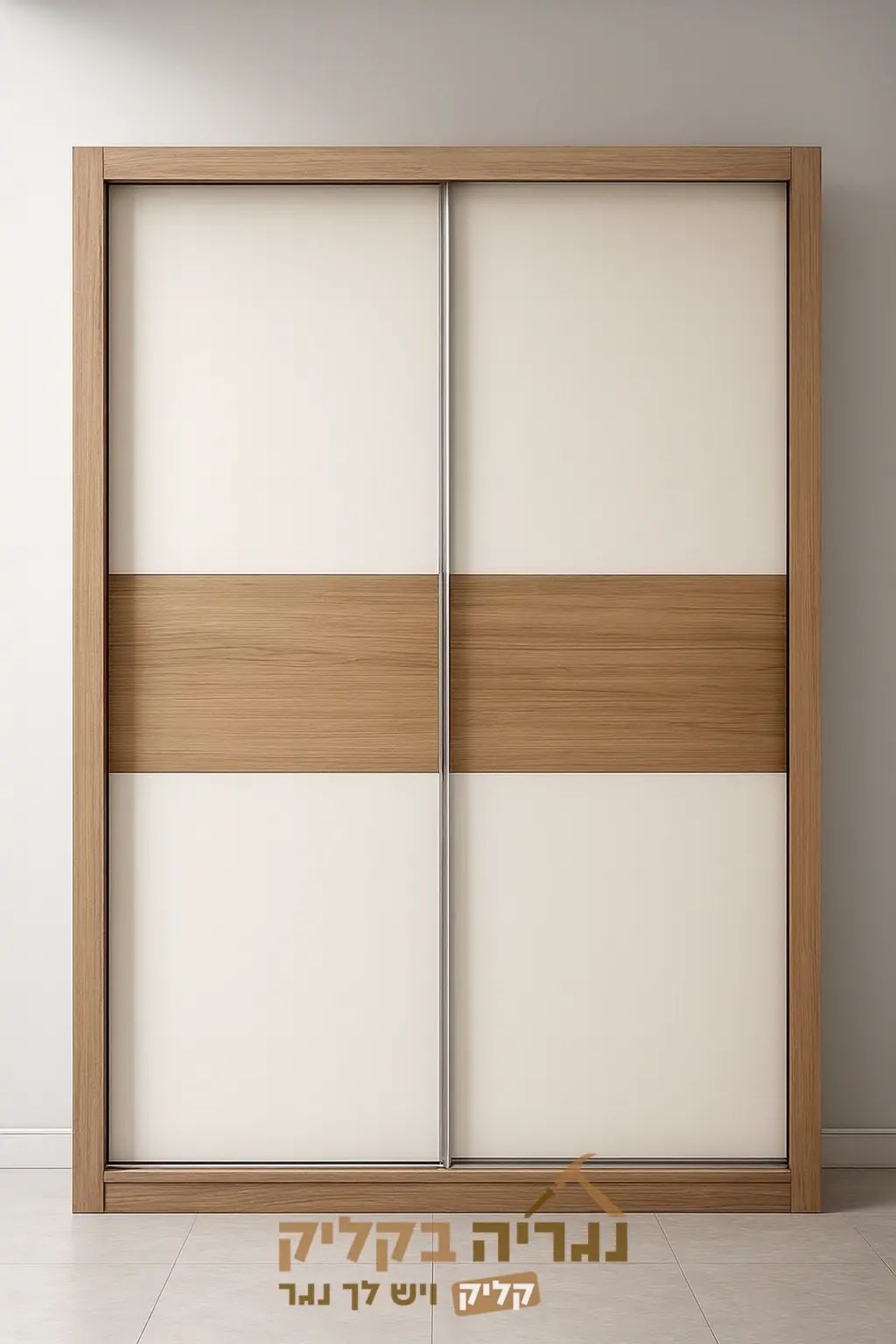 ארון הזזה מודרני בשילוב צבעים אלגנטי של אלון טבעי ושמנת חלקה, עם שתי דלתות רחבות בפתיחה שקטה וחלקה. פנים הארון כולל מדפים מרווחים ומגירות נשלפות לאחסון נוח ומסודר של בגדים, מצעים ופריטים אישיים.