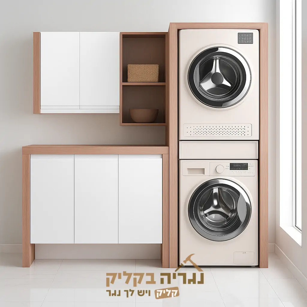 הארון בנוי בעבודת נגרות מדויקת, עם נישה ייעודית למכונת כביסה ומייבש בערימה, לצד ארונות סגורים ומדפים פתוחים לאחסון פרקטי של חומרי ניקוי, מגבות ופריטים נוספים.