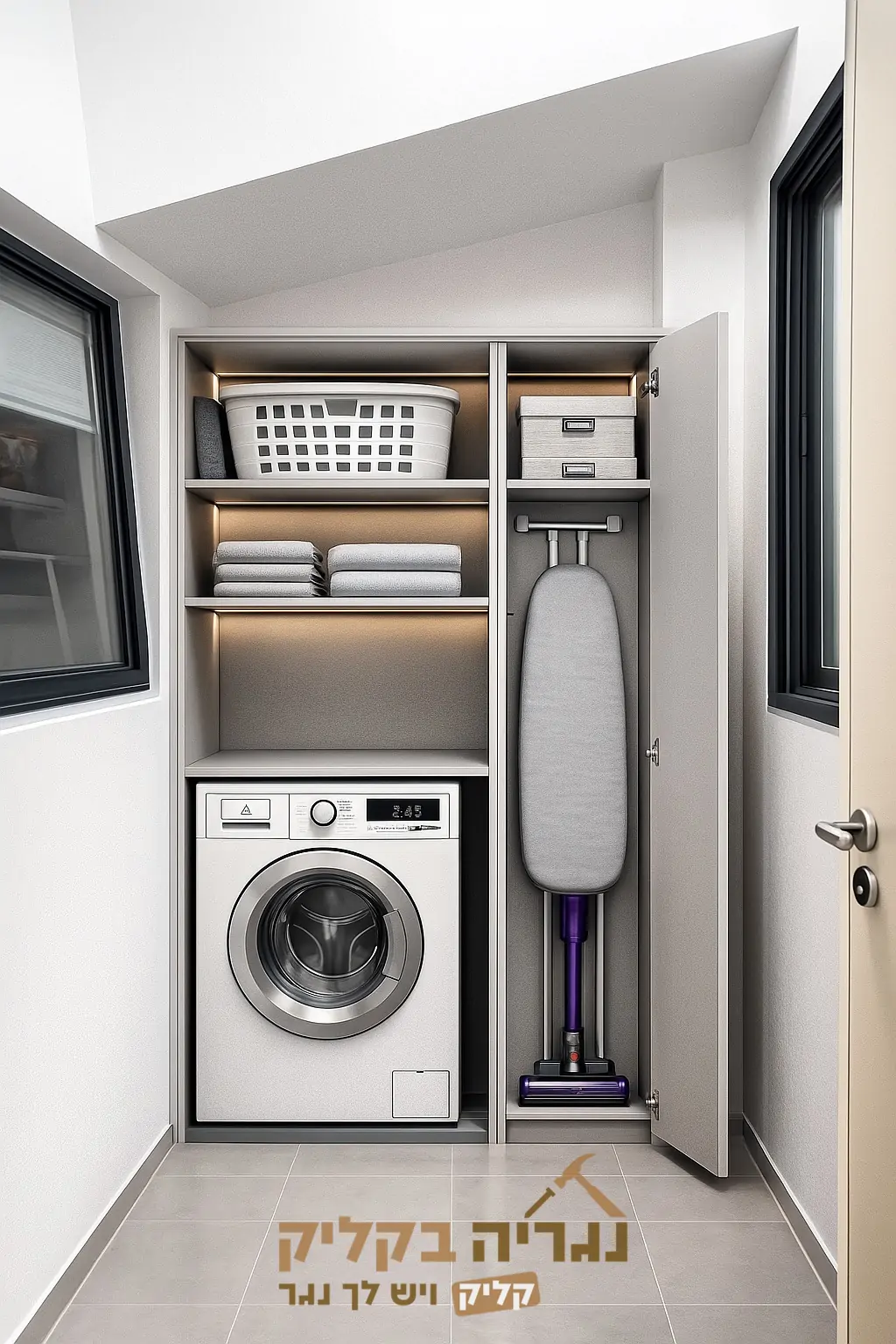 ארון כביסה בנגרות מותאמת אישית, בנוי במידות מדויקות לניצול מקסימלי של חלל קטן. הארון משלב תא ייעודי למכונת כביסה עם יציבות מוגברת, מדפי אחסון עמוקים בגובה משתנה, ותא צדדי צר המיועד לאחסון קרש גיהוץ ושואב עומד. הדלתות מיוצרות מציפוי איכותי עמיד לרטיבות, הצירים סמויים לשמירה על מראה נקי, ותאורת LED אינטגרלית בתוך המדפים משדרגת את השימושיות והנראות. עיצוב פונקציונלי, מינימליסטי ונקי – פתרון אידיאלי לחדרי שירות קטנים.
