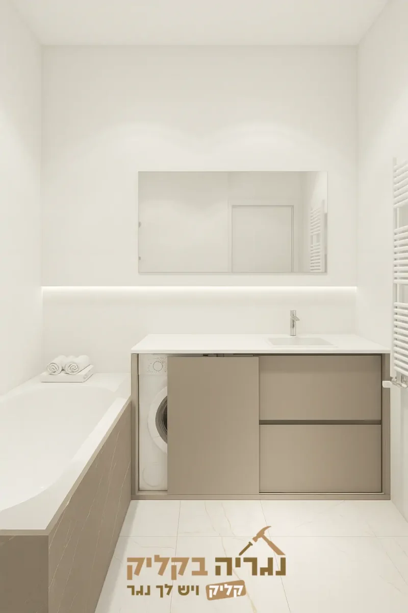 ארון אמבטיה פונקציונלי ואלגנטי בגימור אבן חול (Taupe) עם משטח עליון לבן, הכולל כיור מובנה. הארון תוכנן במיוחד לשלב באופן דיסקרטי אחסון למכונת כביסה עם שתי מגירות רחבות וסגורות. האחסון למכונה מוסתר מאחורי דלת הזזה נוחה, המאפשרת פתיחה חלקית ומלאה לשמירה על מראה נקי ואסתטי בחלל. פתרון עיצובי ופונקציונלי הממקסם את שטח חדר הרחצה.