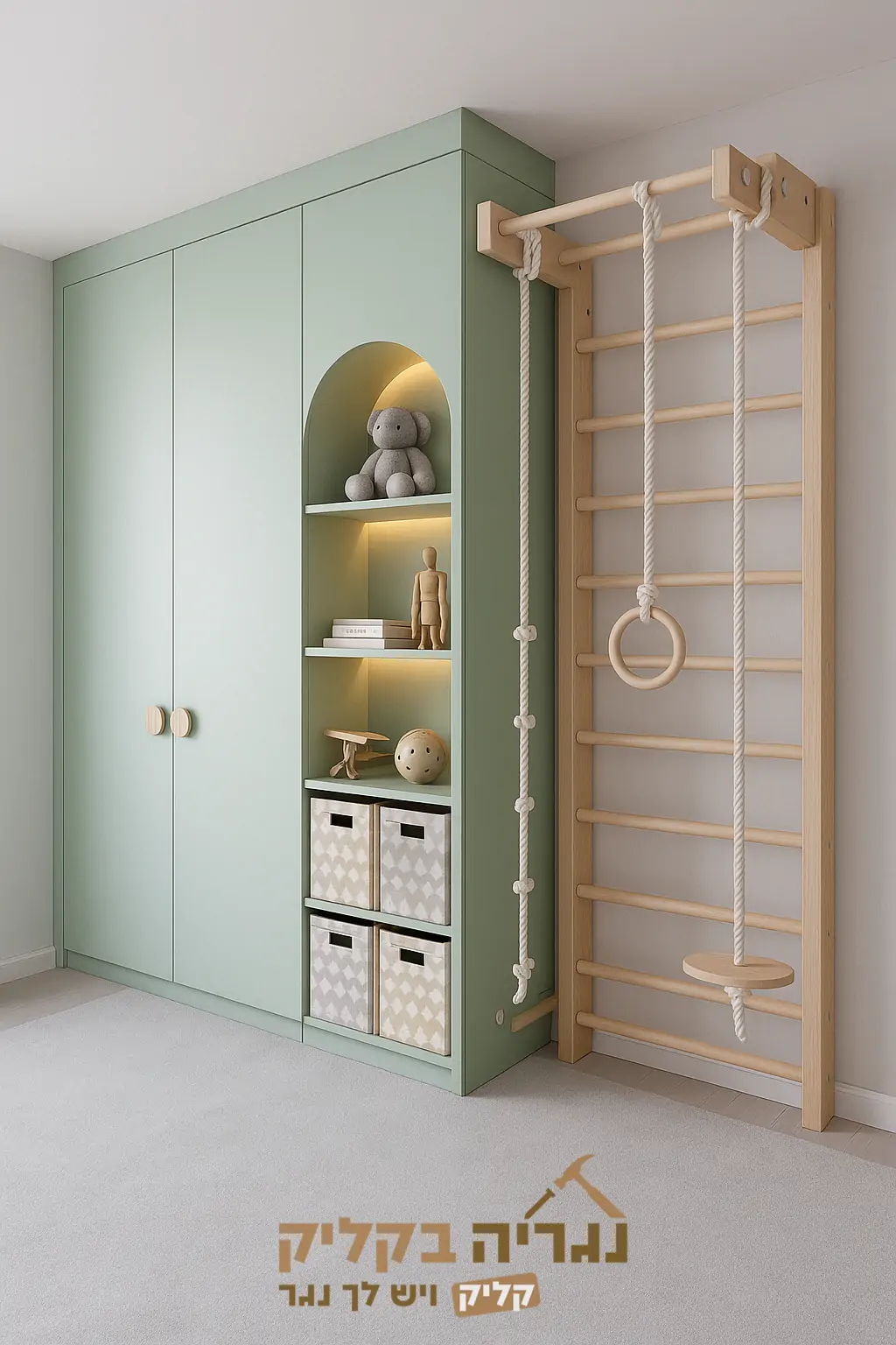 יחידת נגרות בהתאמה אישית בסגנון סקנדינבי ובגוון ירוק-מרווה. העיצוב משלב ארון בגדים עם נישה פתוחה בצורת קשת ותאורה נסתרת, לצד סולם שוודי מעץ מלא. התכנון המוקפד יוצר חיבור הרמוני בין פתרונות האחסון לאזור המשחק בחלל.
