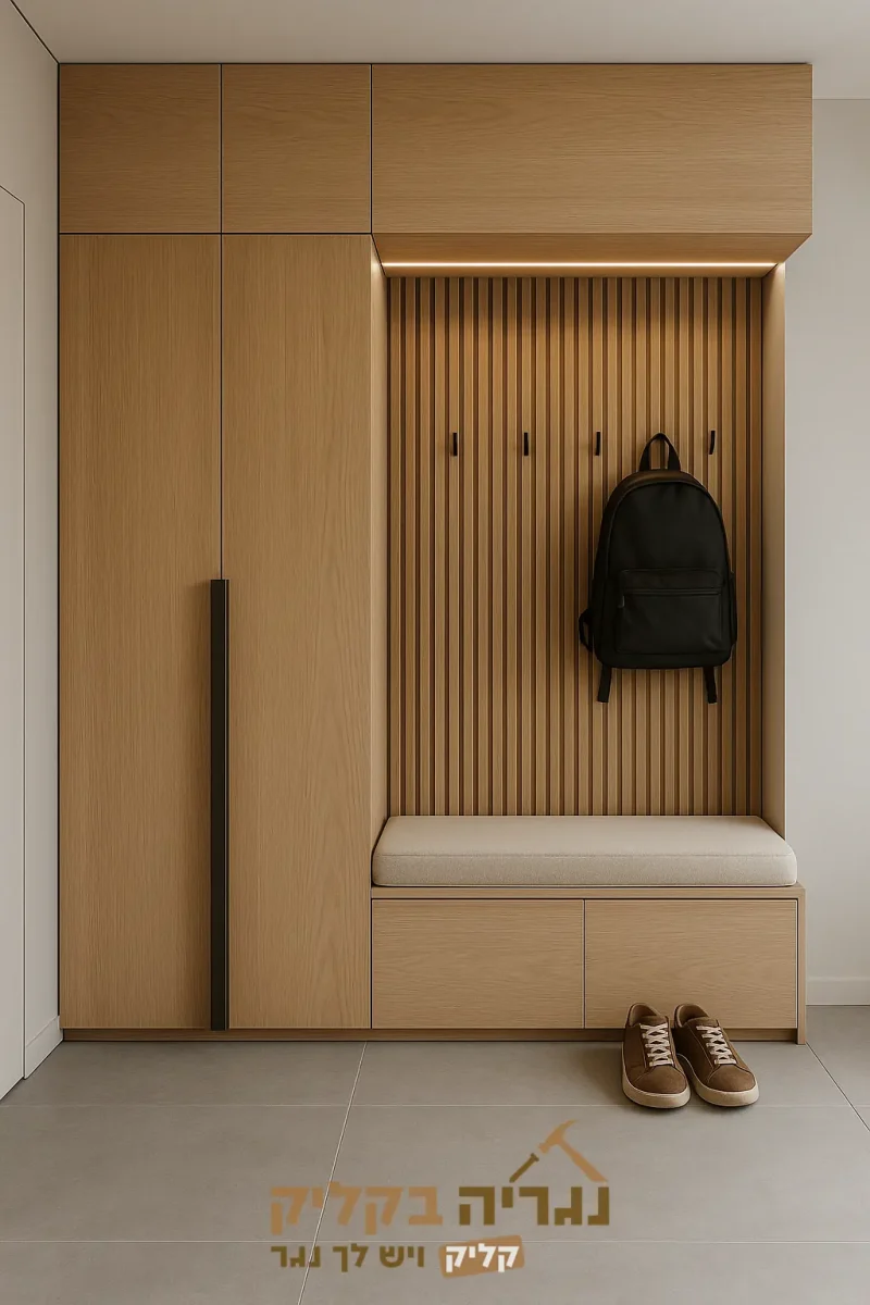 ארון כניסה מודרני ואלגנטי מעץ בהיר, המשלב אחסון סגור עם פתרון ישיבה ותלייה פתוח. יחידת האחסון הגבוהה כוללת ידית שחורה ארוכה ובולטת, ולידה פינת מעבר מזמינה עם חיפוי קיר דקורטיבי מחורץ, תאורת LED נסתרת, מתלי תלייה שחורים וספסל מרופד נוח. בתחתית הספסל יש שתי מגירות איחסון נוספות. פתרון עיצובי פונקציונלי ומחמם לכל מבואת כניסה.