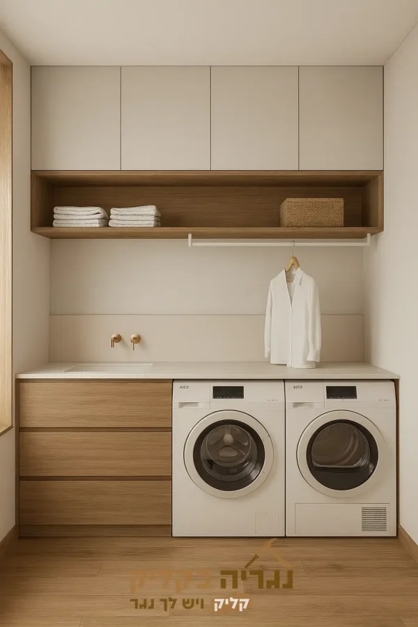 ארון כביסה מודרני ואלגנטי המשלב פרקטיקה ועיצוב. הסט כולל יחידת אחסון עליונה עם דלתות לבנות חלקות לאחסון סגור, ומדף פתוח מעץ טבעי עם מתלה תחתון. חלקו התחתון מורכב ממשטח עבודה מואר (ככל הנראה אבן בהירה/קוורץ) מעל מגירות אחסון רחבות מעץ בגוון אלון בהיר/טבעי, ומקום מובנה ומדויק למכונת כביסה ומייבש. השילוב של הלבן הבהיר עם גווני העץ והפרזול המוזהב העדין יוצר מראה נקי, חמים ומזמין.
