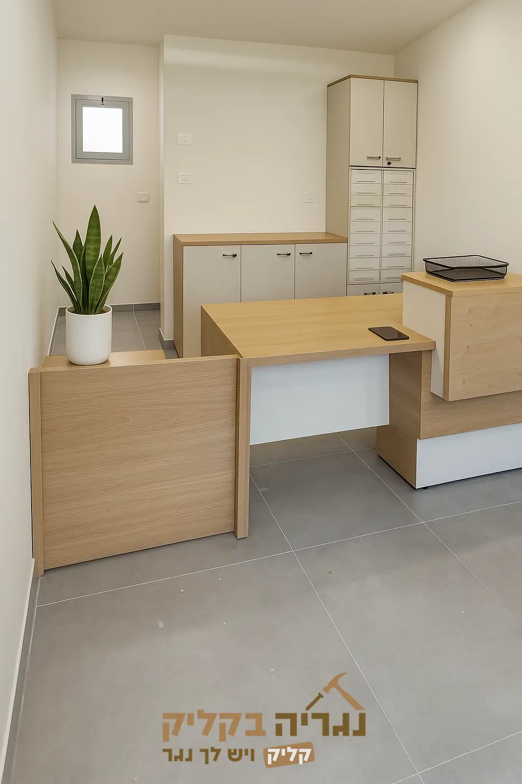 דלפק קבלה מעוצב בגוון עץ טבעי בשילוב לבן, בעיצוב מודרני ונקי המעניק לחלל תחושת סדר ופתיחות.