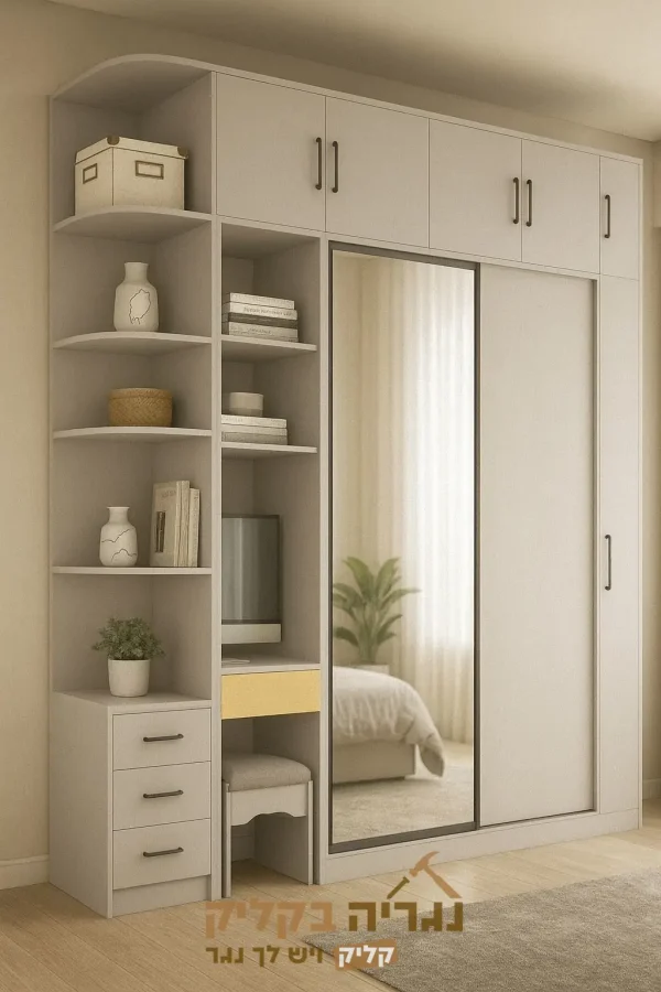 ארון "רנסנס מודרני" הוא הפתרון האולטימטיבי לחלל שינה מעוצב. גווניו הבהירים והניטרליים יוצרים אווירה רגועה ואלגנטית, והוא תוכנן להתאים לצרכים המשתנים שלכם. הארון מציע שילוב חכם של שטח אחסון סגור עם דלתות הזזה חוסכות מקום, מראה באורך מלא המרחיבה את החלל, ומדפים פתוחים מעוצבים המיועדים לתצוגת פריטים דקורטיביים או ספרים. שידת מגירות צידית ופינת איפור או עבודה קטנה מובנית עם מגירה צהובה-חרדלית מוסיפים נגיעה של צבע ופרקטיות, והופכים את הארון ליחידה שלמה ומעוצבת.