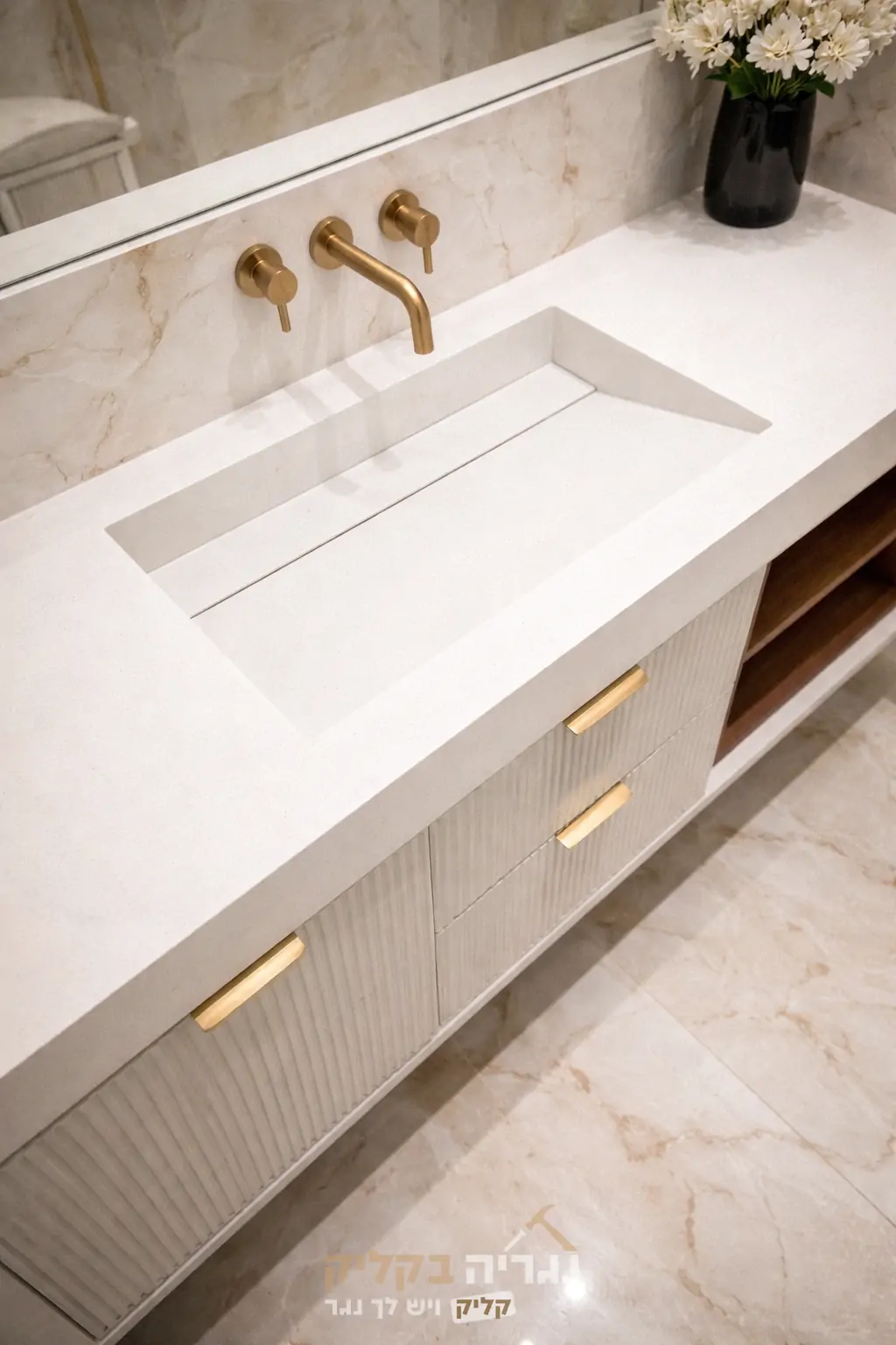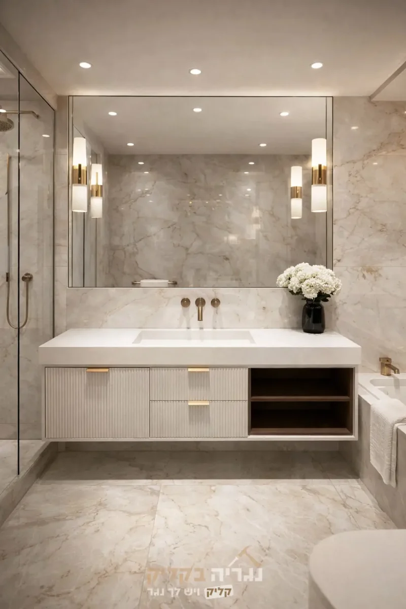 ארון אמבטיה יוקרתי בעיצוב נקי ומודרני, המשלב חזית חריצים אלגנטית בגוון בהיר עם ידיות זהב עדינות שמוסיפות טאץ' של יוקרה לכל חלל.
