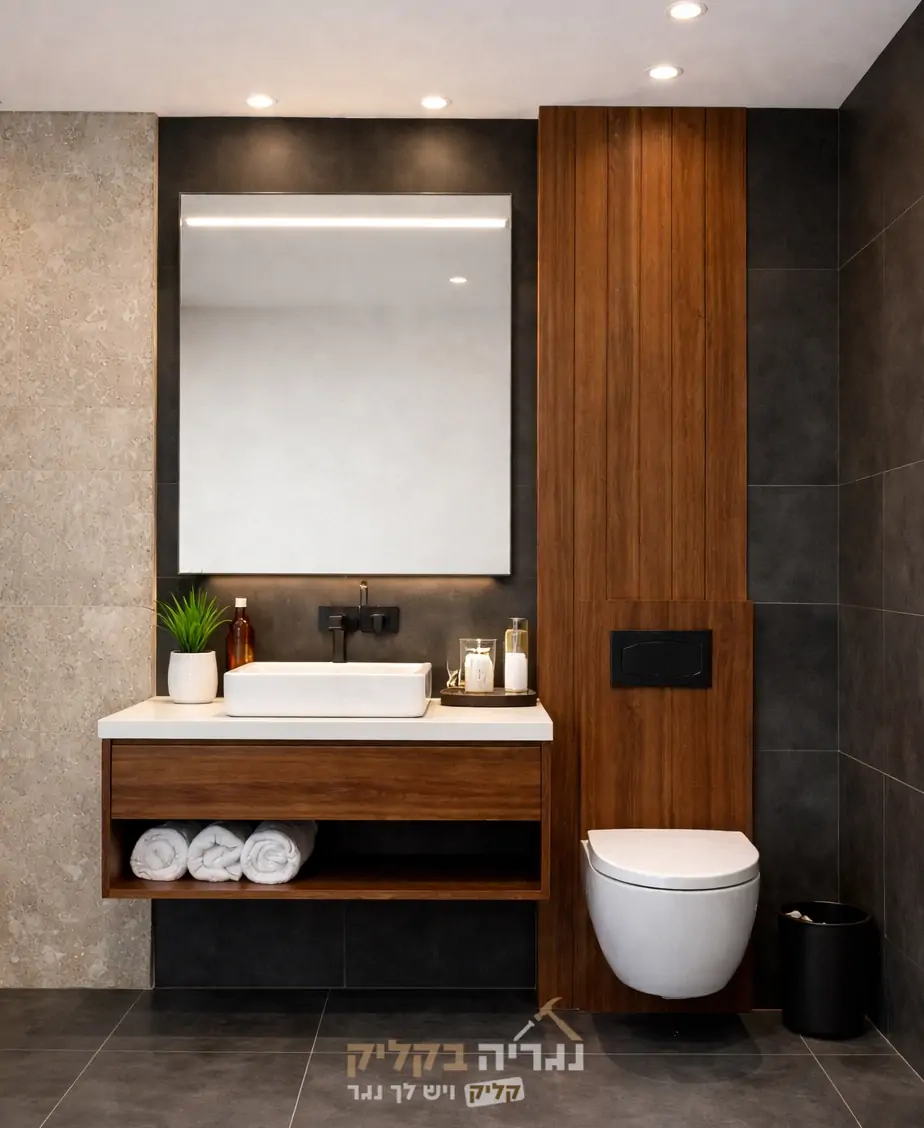 ארון אמבטיה ייחודי בעיצוב מודרני עם משחק חכם של חומרים וגוונים, המשלב בין עץ טבעי בגוון עמוק לבין קירות בגימור כהה ליצירת מראה דרמטי, אלגנטי ויוקרתי במיוחד.
