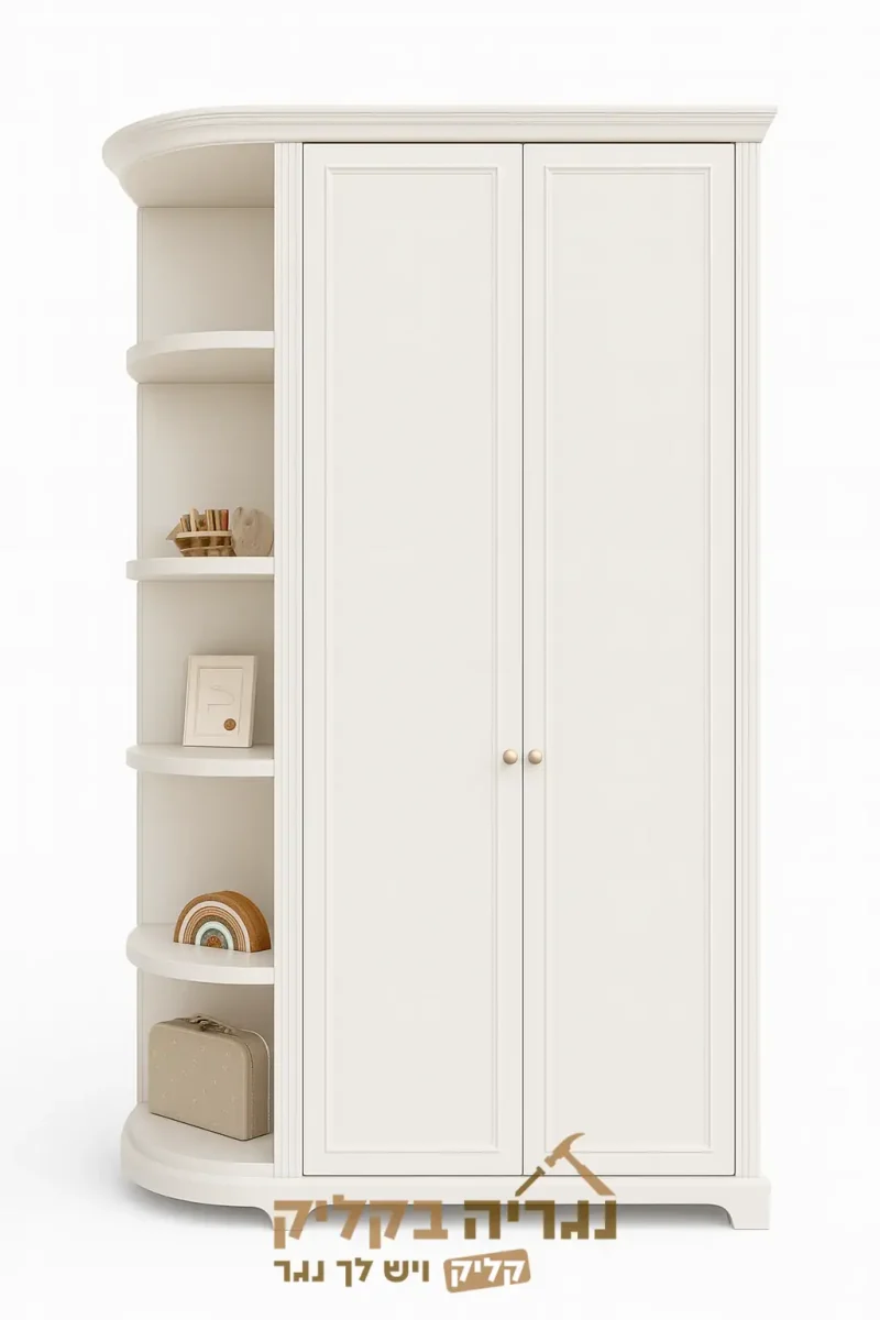 ארון פינתי בעיצוב קלאסי בגוון שמנת רך, עם דלתות מעוטרות במסגרת עדינה וידיות עגולות תואמות. בצידו הימני שני מדפים פתוחים מעוגלים המעניקים מראה ייחודי ומשלימים את הפינה בצורה מושלמת.