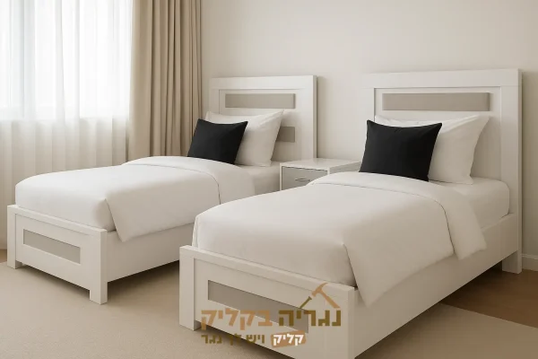 שתי מיטות יחיד זהות, בעיצוב מודרני ונקי. המיטות עשויות מעץ בצבע לבן פנינה, עם ראש מיטה ומרגל מעוצבים במסגרת מלבנית ובתוכה לוח פנימי בצבע בהיר יותר גוון שמנת או אפור עדין.