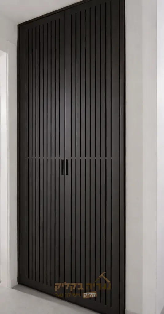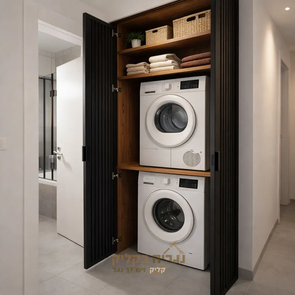 ארון כביסה בהתאמה אישית עם דלתות פסים אנכיים בגימור שחור דרמטי שמעניקות מראה יוקרתי ואדריכלי. הדלתות הופכות את אזור הכביסה לאלמנט עיצובי ולא רק פונקציונלי, תוך הסתרה מלאה של המכונות ושמירה על קו נקי ומסודר. פנים הארון בגוון עץ חם עם מדפים שימושיים לאחסון חכם של מגבות וחומרי ניקוי. פתרון מושלם לנישה במסדרון או ליד חדר רחצה, ברמת גימור גבוהה במיוחד ובהתאמה מלאה לחלל.