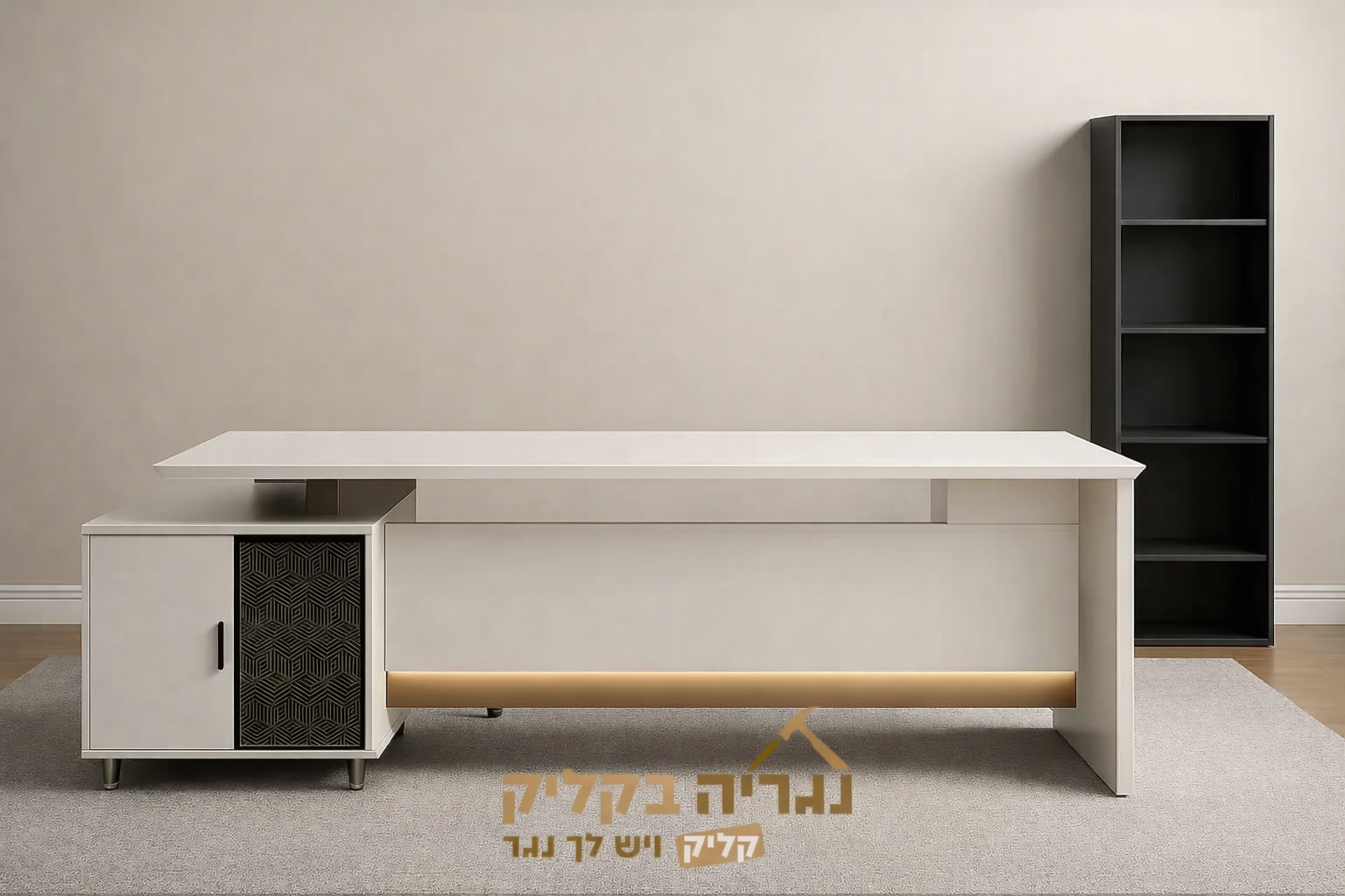 שולחן מנהלים מעוצב בסגנון מודרני ונקי, המשלב פונקציונליות עם עיצוב יוקרתי ומוקפד.