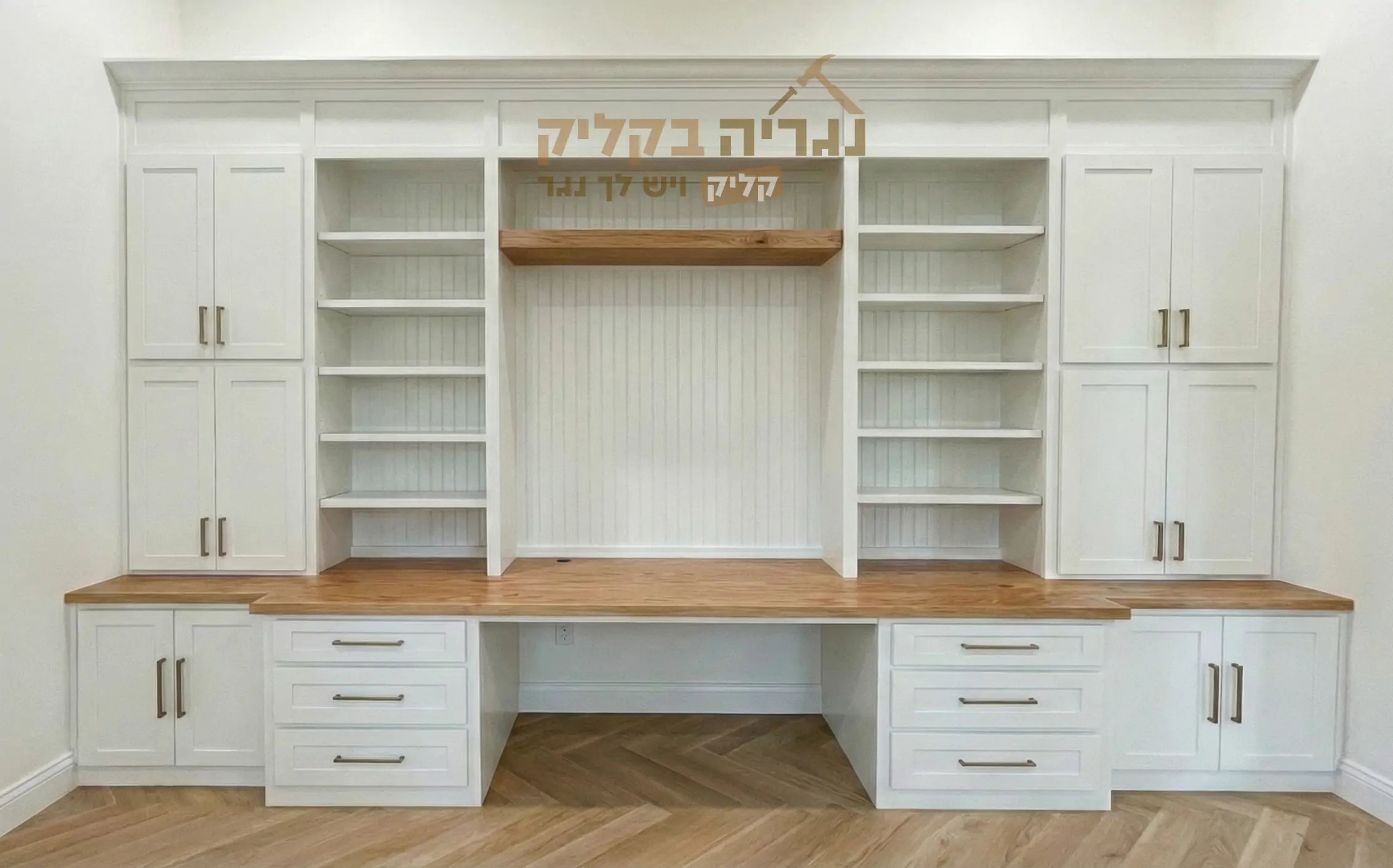 ספריית עבודה הריטג קלאסיק משלבת ארונות צד גבוהים, מדפים פתוחים ושולחן עבודה רחב במרכז ליצירת קיר עבודה מרשים ומאוזן. השילוב בין חזיתות לבנות עם מסגרות עדינות למשטח עץ חם יוצר מראה יוקרתי על זמני שמתאים לחדר עבודה או לחדר שינה גדול.
