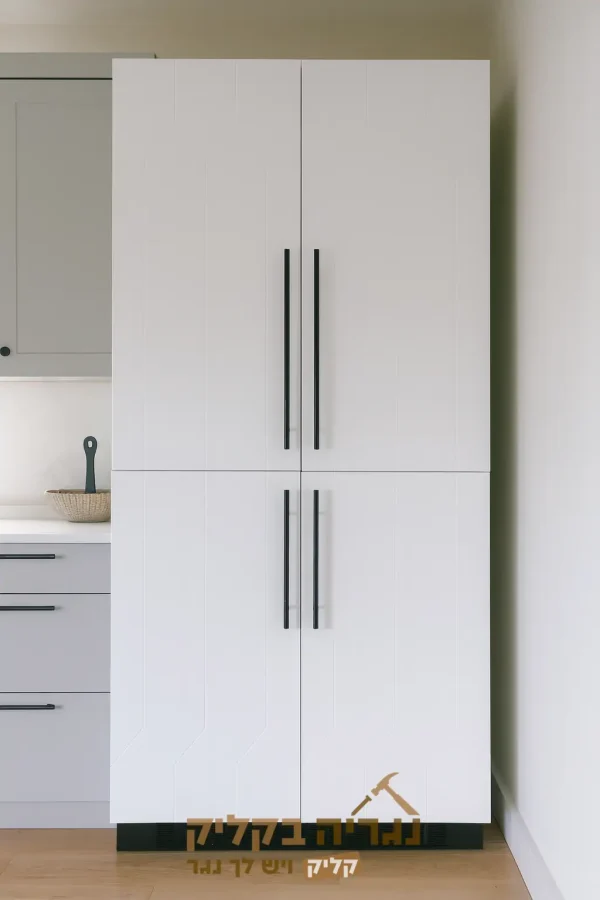 ארון אינטגרלי מעוצב למקרר, בגוון לבן חלק עם ידיות שחורות ארוכות למראה אלגנטי ומדויק. הארון משתלב בצורה מושלמת במטבח ומעניק קו אחיד ויוקרתי.ציפוי פורמייקה עמידה, עם נגרות מוקפדת המותאמת אישית לכל סוג מקרר. שילוב מושלם של פונקציונליות ואסתטיקה.