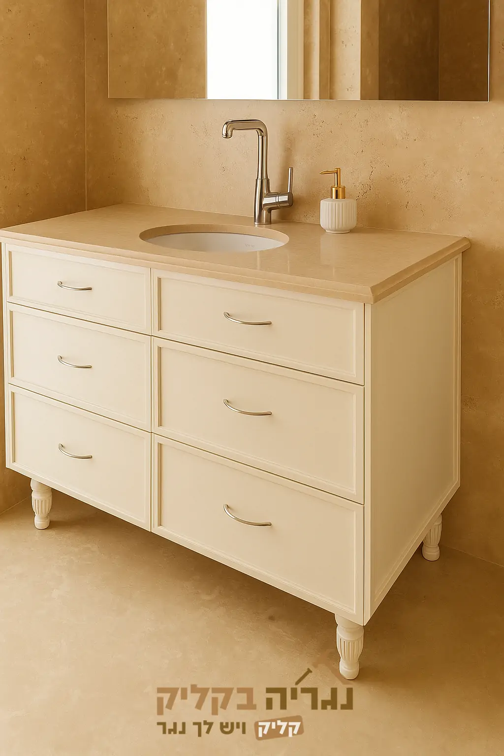 המשטח העליון עשוי שיש איכותי בגוון בז’ עדין, הכולל כיור אינטגרלי מעוצב וברז מודרני בגימור ניקל מוברש.