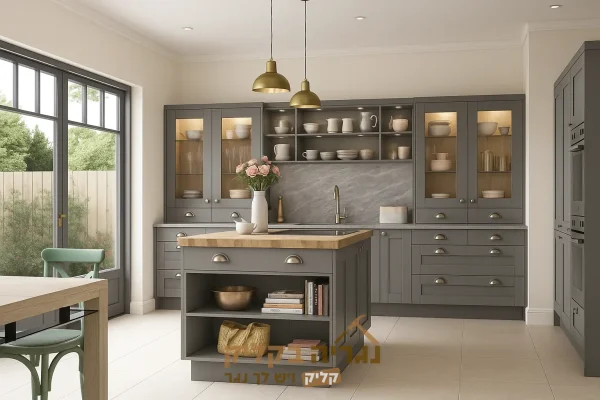 מטבח מעוצב בסגנון מודרני-כפרי בגוון אפור עמוק, עם חזיתות מסגרת אלגנטיות, ידיות מתכת בסגנון וינטג' וגימור מוקפד עד הפרט האחרון.