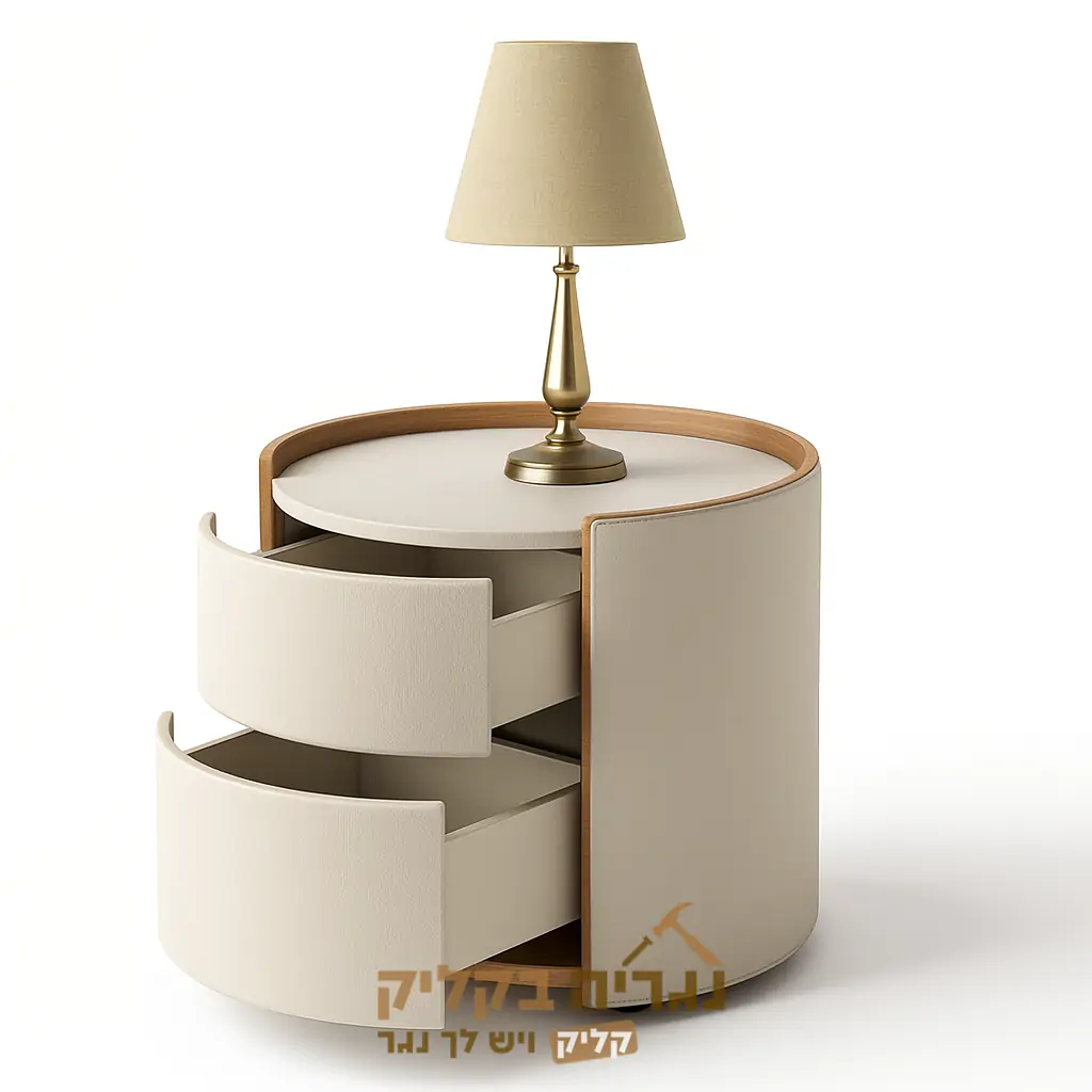 שידת לילה בעיצוב עגול וחדשני, המשלבת קווים רכים עם מראה מודרני ומלוטש.