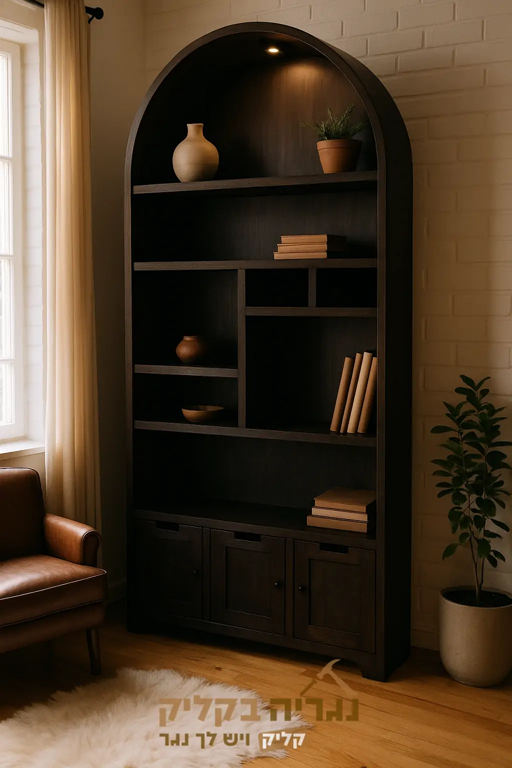 הספרייה עשויה מעץ איכותי בגוון חום כהה עשיר, עם קשת עליונה ייחודית שמעניקה מראה מעודן ומעוגל, ותאורה עליונה המדגישה את הפריטים שבתצוגה.