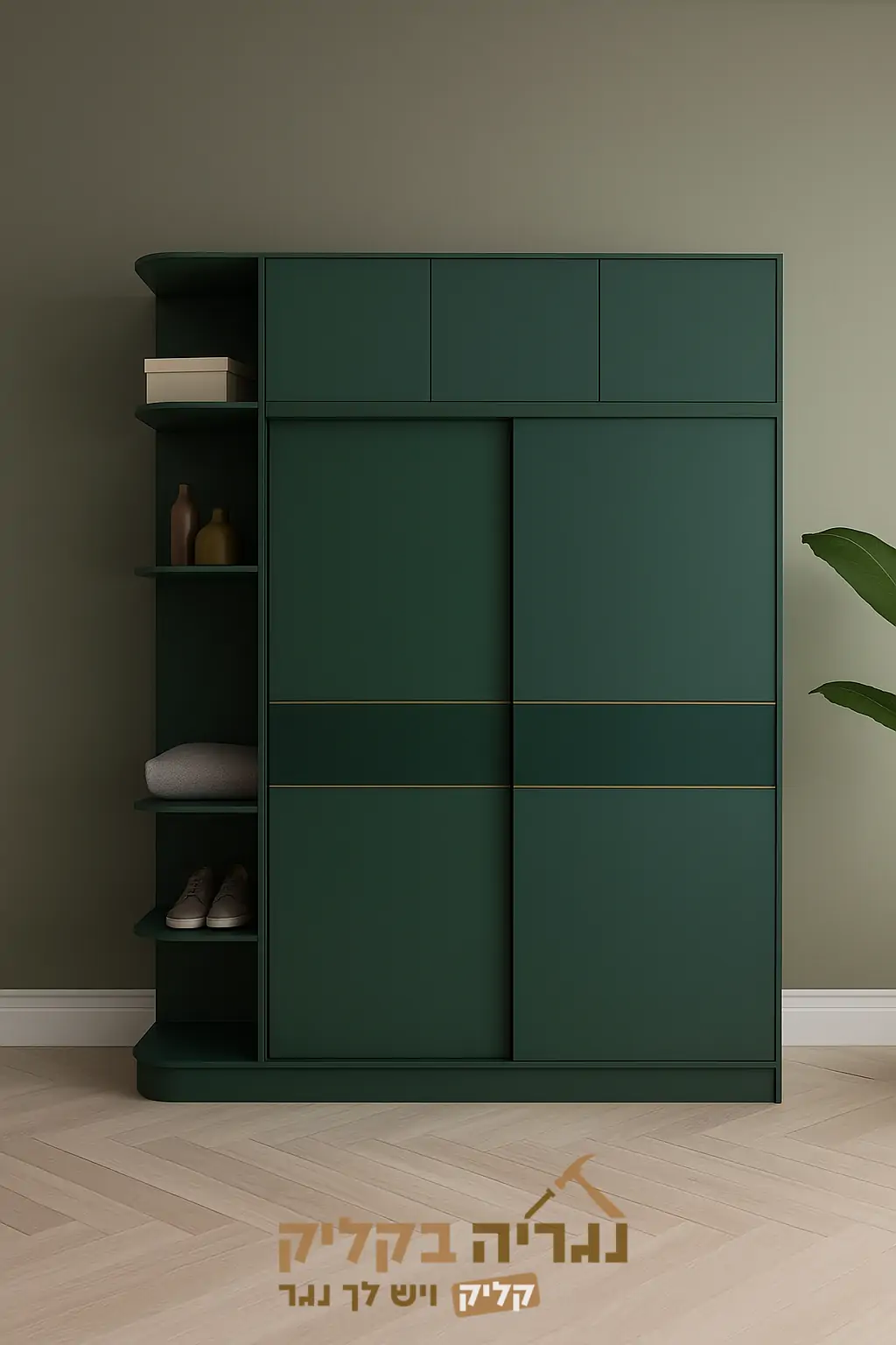 ארון קיר בעיצוב מודרני ומדויק בגוון ירוק בקבוק עמוק, עם נגיעות פסי זהב עדינים המעניקים מראה אלגנטי ויוקרתי במיוחד.