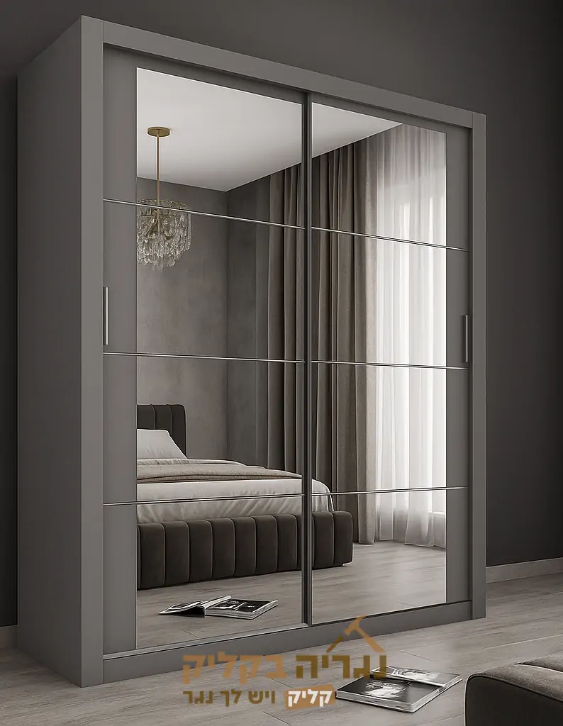 ארון קיר יוקרתי בעיצוב מודרני ונקי, בגוון אפור מט עם דלתות מראה המחולקות בקווים אופקיים עדינים, ליצירת מראה אלגנטי ותחושת מרחב רחבה בחדר.