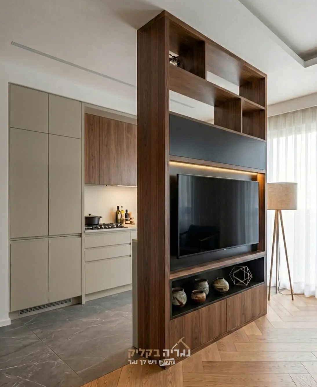 היחידה כוללת נישה ייעודית לטלוויזיה עם תאורה נסתרת שמדגישה את האלמנט המרכזי ויוצרת אווירה יוקרתית ונעימה בחלל. העיצוב האוורירי מאפשר מעבר אור טבעי בין האזורים, מה שהופך אותה לפתרון אידיאלי לחללים משולבים כמו סלון ומטבח.