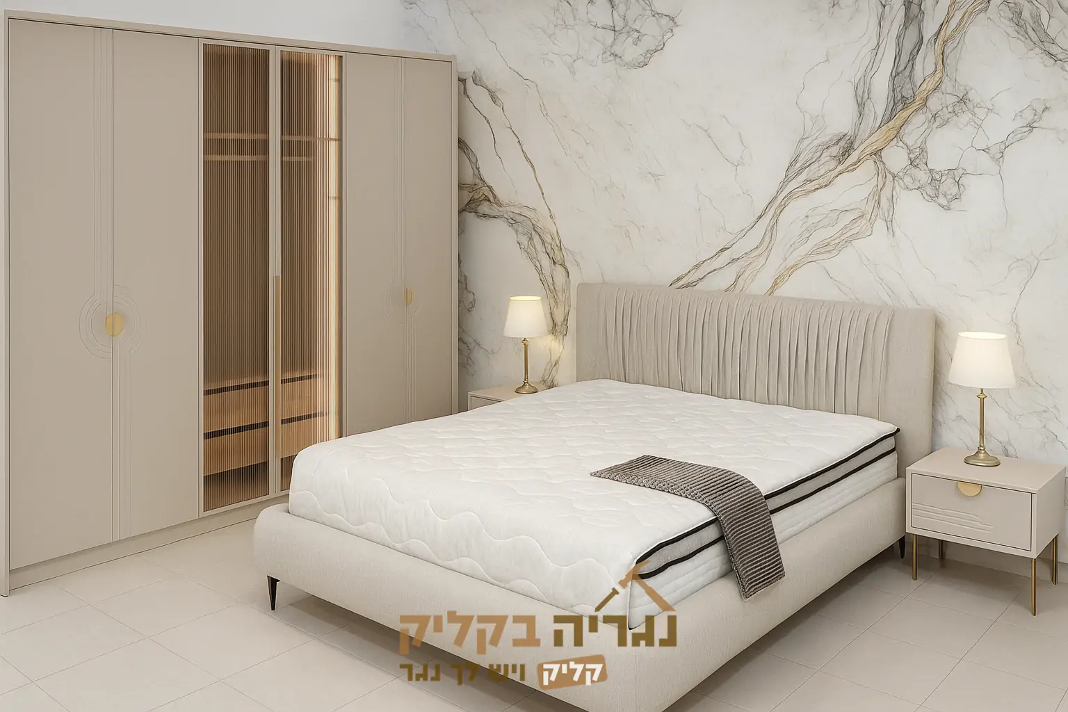 חדר שינה מעוצב בגוונים בהירים ונעימים המשלב מיטה זוגית מרופדת בבד איכותי עם שתי שידות תואמות וארון רחב הכולל תאורה פנימית חמה. הקווים הנקיים והפרטים האלגנטיים יוצרים מראה מודרני ומרגיע, המתאים לכל בית המעוניין באווירה יוקרתית ונעימה.