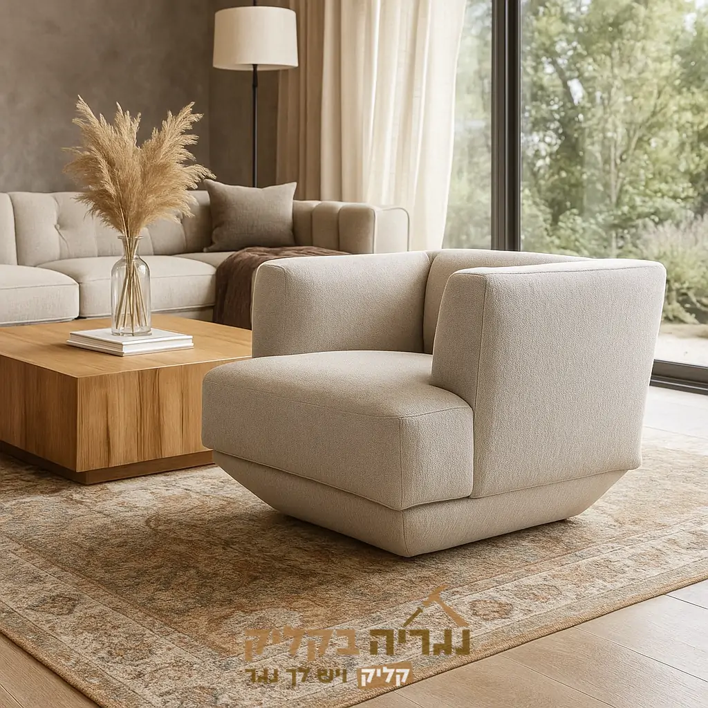 הריפוד עשוי בד איכותי בגוון בז׳ בהיר, נעים למגע ועמיד בפני שימוש יומיומי, בעוד שמבנה הישיבה הרחב מספק נוחות מושלמת ותמיכה ארגונומית מלאה.