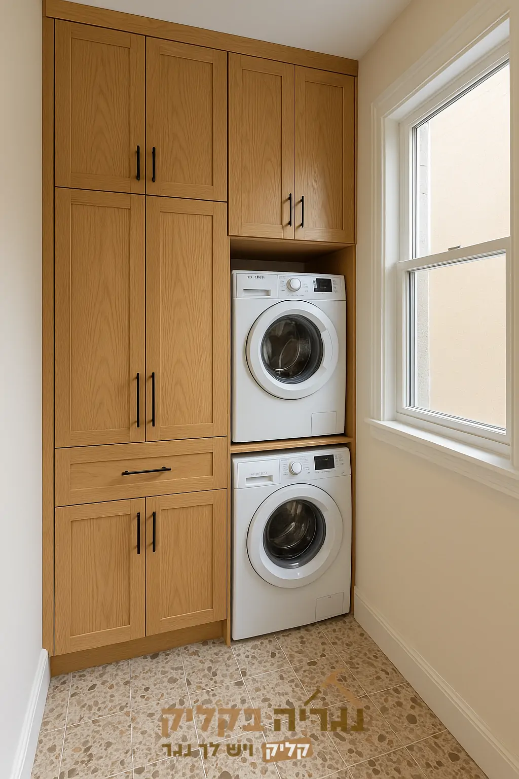 ארון שירות יוקרתי בעיצוב מודרני, עשוי MDF בגימור עץ אלון טבעי. כולל נישה כפולה למכונת כביסה ומייבש ומספר דלתות אחסון מרווחות לארגון מושלם של חומרי ניקוי, מגבות וציוד ביתי.