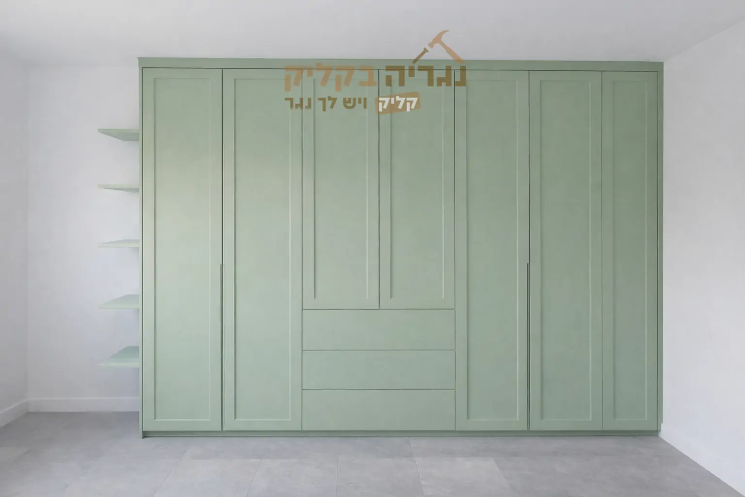 ארון בגדים פיסטוק אלגנס בעיצוב נקי עם מסגרות עדינות וגוון ירקרק רך שנותן לחלל אופי מיוחד ולא שגרתי. שילוב של דלתות גבוהות עם מגירות מרכזיות יוצר מראה מאוזן ומסודר שמתאים לחדר שינה מודרני עם טאץ’ חמים.