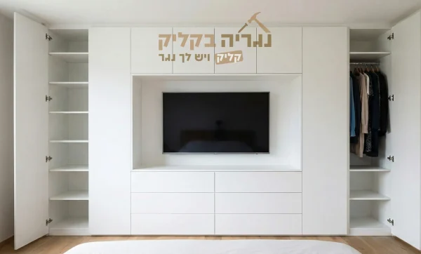ארון קיר בהתאמה אישית מהרצפה ועד התקרה, בעבודת נגרות מדויקת בקווים נקיים ומודרניים. שילוב חכם של אזורי תלייה, מדפים פתוחים, מגירות רחבות עם טריקה שקטה ונישה מרכזית לטלוויזיה בגימור מושלם. גוף הארון עשוי סנדוויץ איכותי וחזיתות בגימור חלק ומוקפד, עם פרזול איכותי ועמידות גבוהה לאורך שנים. פתרון אחסון מקיף שמנצל את כל הקיר ומשלב פונקציונליות מלאה עם מראה יוקרתי ומסודר.