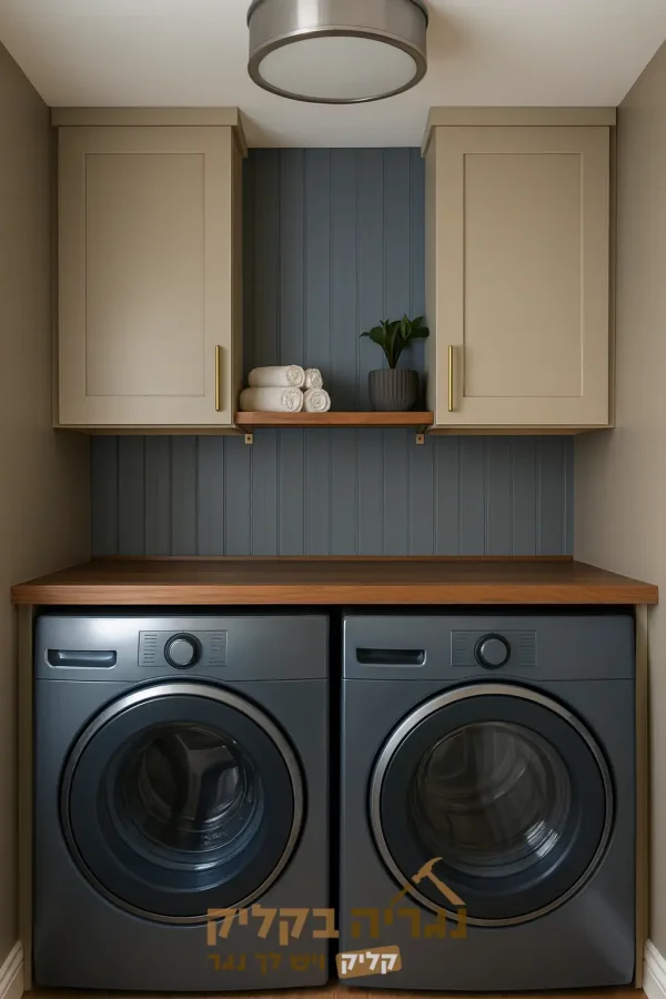 העיצוב כולל נישה מותאמת למכונת כביסה ומייבש, עם משטח עץ עליון איכותי לעבודה או קיפול בגדים, וארונות תלויים עם ידיות זהב המוסיפים מראה אלגנטי ונקי.