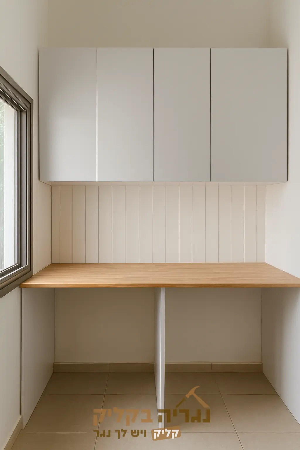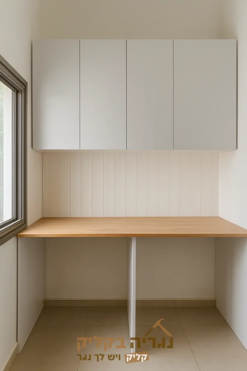 עמדת שירות מעוצבת לחדר כביסה עם משטח עבודה רחב בגוון עץ טבעי, המשולב עם ארונות עליונים חלקים בגוון לבן ליצירת מראה מודרני ונקי. הפתרון האידיאלי לניצול חכם של חללים צרים, המשלב פונקציונליות, נוחות ואסתטיקה מושלמת.