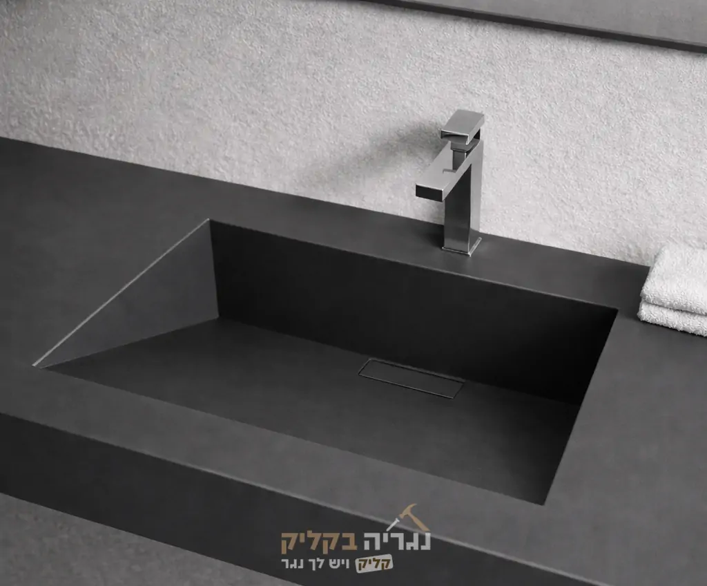ארון אמבטיה יוקרתי בהתאמה אישית. עיצוב מודרני-נורדי המשלב בין מינימליזם נקי לבין חמימות טבעית. הארון כולל משטח עליון בגוון שחור מט עם כיור אינטגרלי בקו אפס, היוצר מראה חלק, אלגנטי ויוקרתי במיוחד.