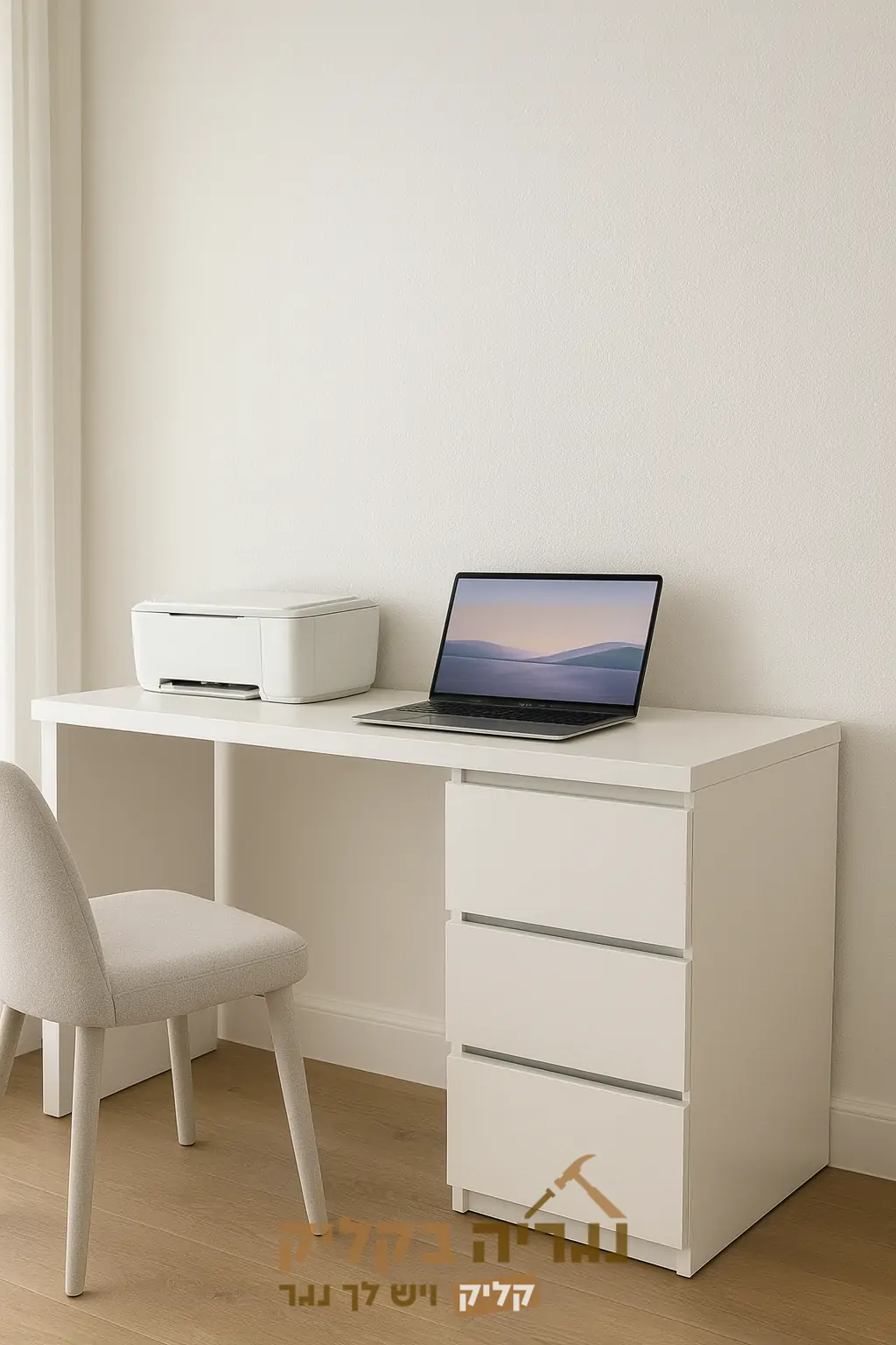 השולחן עשוי בצבע לבן מט עם קווים ישרים ומראה מינימליסטי, המתאים לכל חדר עבודה או פינת לימודים.