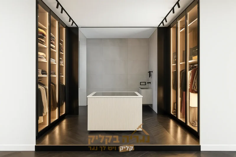 אי מרכזי יוקרתי לחדר ארונות בעיצוב מודרני ונקי, בגוון לבן שמנת עם טקסטורת פסים אנכיים עדינים. משטח עליון מזכוכית מחוסמת שקופה המעניק מראה אלגנטי ותחושת מרחב. מתאים לאחסון פריטים קטנים, תכשיטים ואביזרי לבוש, ומשלים את עיצוב חדר הארונות במראה יוקרתי ומאוזן.